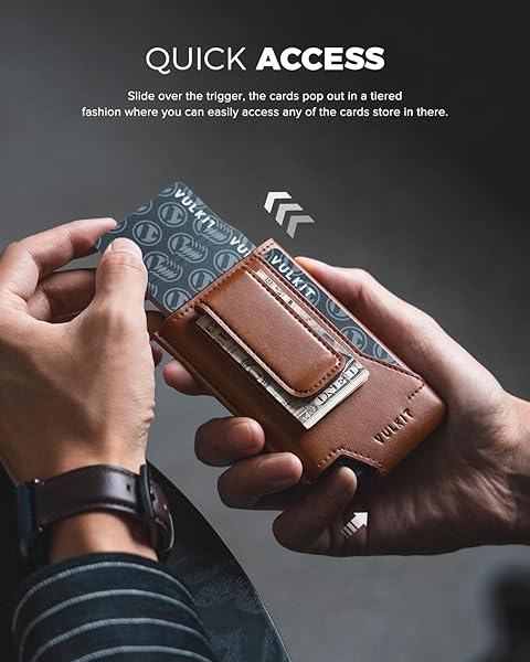 - VULKIT Mens Wallet Card Holder Pop Up Card Wallet Slim Leather RFID Blocking Minimalist Wallet With Money Clip Brown offers reliable performance and quality- QUICK ACCESS DESIGN - This pop up wallet can hold up to 5 embossed cards or 7 flat cards. With a simple press of your thumb, the cards in the wallet will pop out in an organized and smooth manner, making it easy to get any card you need with just one hand