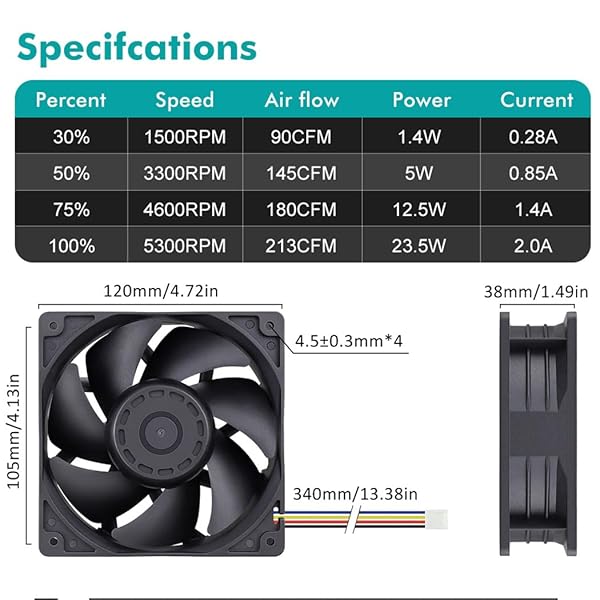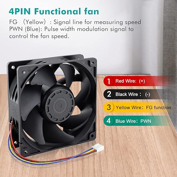 - Wathai 12038 120mm x 38mm PWM Computer PC Case Fan 12V 4pin 5300rpm 230 CFM High Airflow Duall Ball CFM FG DC Brushless Cooling Fan: reliable performance and quality- Dimensions: 120x120x38 mm ( 4.72x4.72x1.5 in ) | Rated Voltage :12V- Dual-ball bearings have a lifespan of 67,000 hours and allows the- High Speed: High static pressure 120mm fan designed for projects that- Connector: 4PIN; (+): Red Wire ; (-): Black Wire. FG function:Yellow