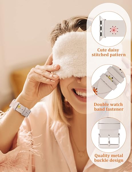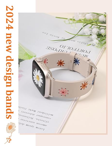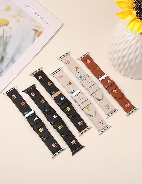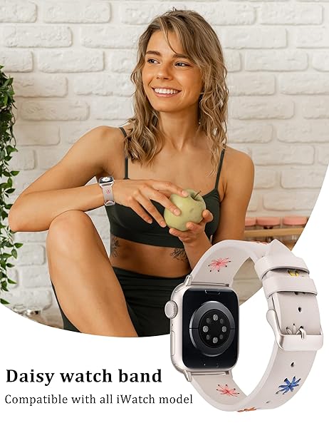 - Wearlizer Floral Leather Band Compatible with Apple Watch Bands Women 41/40/38/42mm(Series 11/10), Feminine Boho Soft Leather Strap with Cute Daisy Stitched for iWatch Series 9/8/SE/7/6/5/4/3/2/1 with reliable performance and quality- [Original and Eye-catching Design] Stylish and cute bracelets are made of high-quality leather and hand-stitched, with bright and vivid daisy pattern. It goes with so many articles of clothing, and the daisies dont wear off. Exactly what you are look