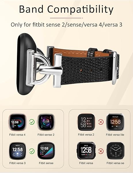 - Wearlizer Women's Leather Band for Fitbit Versa 3/4/Sense 2 - Elegant D-Shape Metal Buckle, Premium Leather, Skin-Friendly, Secure Connectors, 1 Year Warranty with reliable performance and quality- CompatibilityWearlizer classy leather band is ONLY compatible with fitbit versa 3 bands/sense bands/versa 4 bands/sense 2 bands. Fit wrist sizes 5.3"-7.0" (135mm-178mm). Band ONLY, watch is NOT included.- Unique DesignWearlizer compatible with Fitbit Versa 3 bands women features