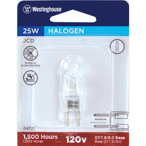 - Westinghouse 04721 Corp 25-watt Halogen Bi-Pin Bulb, Clear: reliable performance and quality- 25T4CD JCD 25W 120V Clear Finish Halogen Light Bulb- 1-15/16" Maximum Overall Length- 2000 Average Rated Hours- Designed for long-lasting use