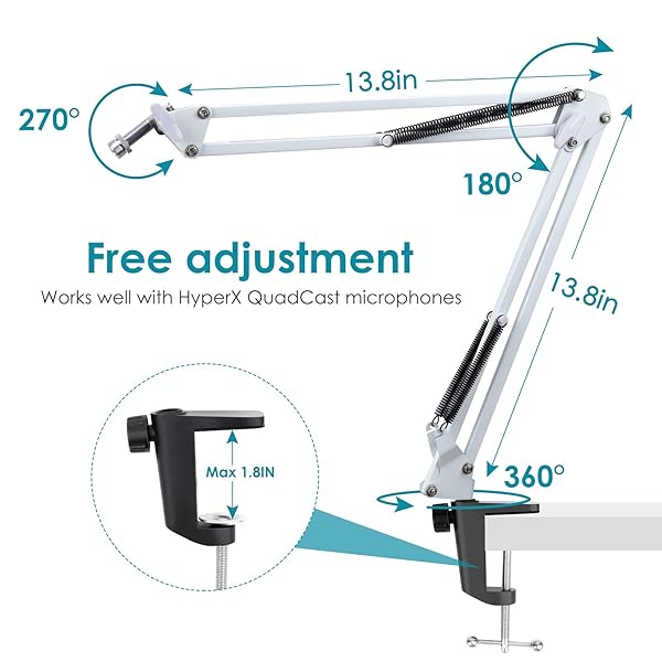 - White Boom Arm for HyperX QuadCast S - White Mic Arm Compatible with Hyperx Quadcast White Microphone, Premium Microphone Boom Arm Stand by YOUSHARES with reliable performance and quality- Perfect Effect - White suspension boom arm hold your QuadCast / QuadCast S Microphone in any position you want. No sag, just rock solid. NOTE: Not Included QuadCast Microphone!- Easy to Adjustment and Position - The White boom arm for QuadCast S microphone rotates 360 degrees and a two ax