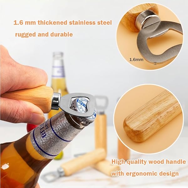 - Bartender Bottle Openers, Beer Bottle Openers, Cider, Soft Drinks -Wood Handle Handheld (set of 6) offers reliable performance and quality- Wood handle stainless steel bottle opener- Comfortable soft grip handels perfect manual bottle opener, practical and simple to use, light- weight and reliable sturdy beverage opener- Remove beer & soda caps with a quick flick of hand using this high-quality bar accessory