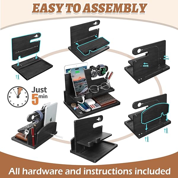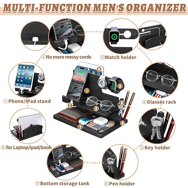 * Wood Phone Docking Station - Nightstand Charging Organizer and Cell Phone Stand - Bedside Gift for Men: stand your life * All in one design support multiple devices charging at the same time * Not only can stand your phone/iPad/earbuds/apple watch for charging * But also free your hands when cooking * Dining and reading