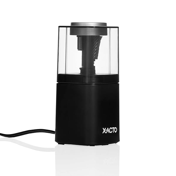 - X-ACTO Powerhouse Electric Pencil Sharpener Black: reliable performance and quality- Break-resistant heavy duty pencil sharpener creates precise tips to reduce lead breakage- Flyaway cutter prevents oversharpening by stopping the cutter when pencil reaches ideal- SafeStart motor stops shaving when bin is removed- Easy-to-empty, large shaving bin means less mess