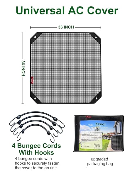 - Xeeol 36x36 Central Air conditioner Covers for Outside, Larger Mesh AC Unit Covers Outdoor - Top Universal Defender offers reliable performance and quality- Rust Resistant and Durable: The AC cover is made from thick resin mesh, this rust-resistant cover is flexible and withstands extreme temperatures. Equipped with a 20 inch stretchable Bungee Cord and stainless steel grommets for added strength