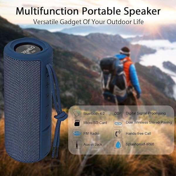- XENEO X21 Portable Bluetooth Wireless Speaker Waterproof with FM Radio, Micro SD Card MP3 Player for Outdoor (Blue) offers reliable performance and quality- Stunning Audio With Rich Bass: With dual passive radiators and Digital Signal Processor, X21 Portable Wireless Speaker pumps out rich bass, astonishing crystal clear sound and enhances clarity of mids and highs without distortion at any volume