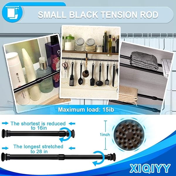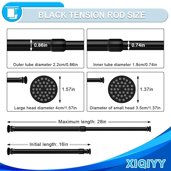 * XIQIYY Strong Small Tension Rods 16 to 28 Inch Diameter 22 MM 1Pcs 1inch Shower Curtain Rod Black, Anti-slip -Heavy Duty Adjustable Spring Tension Rod for Windows,Bathroom: adjustable size & sturdy design the extendable tension rod ranges from 16.826 inches * With a durable 0.86in (2.2cm) outer tube and 0.74in (1.9cm) inner tube * Its thickened construction ensures reliable strength and load-bearing capacity * Non-Slip Rubber Ends Equipped with anti-slip PVC end caps (1.57in / 4cm & 1.37in /