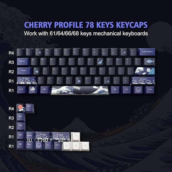- XVX PBT Keycaps - Great Wave of Kanagawa Japanese Design, Dye-Sub Custom Keycaps Set, Cherry Profile for 61/64/66/68 Cherry/Gateron MX Switches, 78 Key Set provides reliable performance and quality- ArtworkThe japanese keycaps adopts the advanced five-sided dye-sub process, the color pattern is more vivid, never oil, the exquisite pattern is like the artwork on the keyboard. you and your belov...