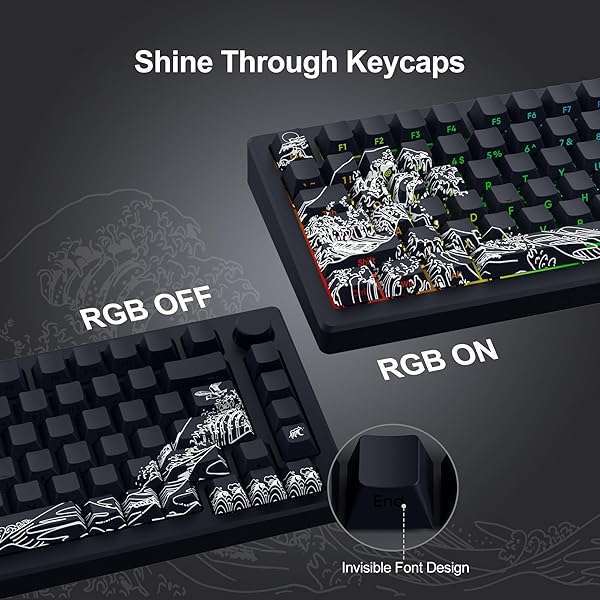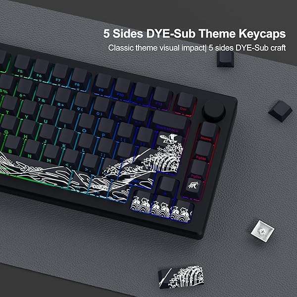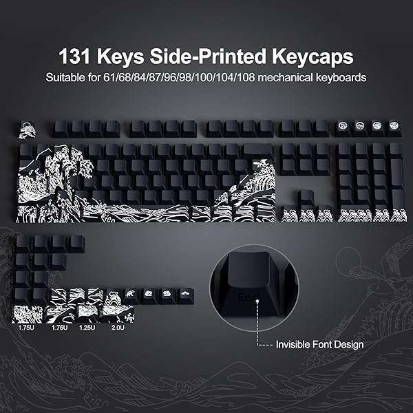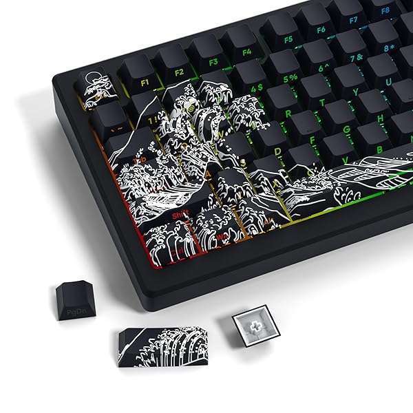 * XVX Shine Through Keycaps - Double Shot PBT Keycaps 60 65 75 100 Percent, Side Print Key caps Custom 131 Keys Set, Dye Sub Wave of Kanagawa Key caps for Mechanical Keyboards: imaginative design with the goal of "let the keycaps express" * XVX has introduced artwork painted on top of side printed keycaps * And they give your keyboard an incredible aesthetic and clean feel.(Note:The side print keycap is more suitable for keyboards with LED facing south.) * Durable Dye Sub PBT Keycaps Made of