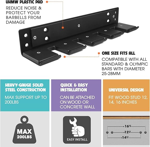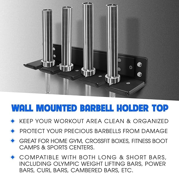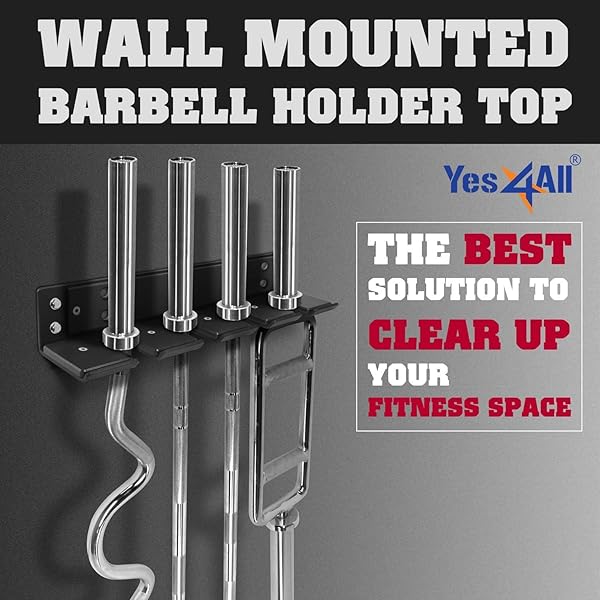- Yes4All Vertical Wall Mounted Olympic Barbell Holder, Barbell Storage Rack, Hanging Barbell Rack for Home Fitness Equipment - 4 bars offers reliable performance and quality- 17. 52 x 4. 25 x 3 inch wall mounted barbell holder top: specially designed with a screw hole-to-hole spacing 2, 12 & 2 inches, Yes4All bar hanger is compatible with 12, 14 & 16-Inch wood studs