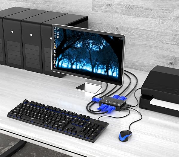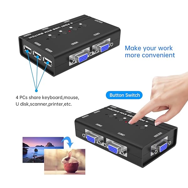 * VGA KVM Switch, Yinker 4 Port USB VGA KVM Switch w/4 KVM Cables & 3 USB Hubs for 4 Computers Share One Monitor Keyboard Mouse: this usb vga kvm switch 4 port allows you to manage 4 pc by one set of keyboard & mouse * Built with novel 2in1 USB VGA cable (the latest version) * It's convenient for 4 computers to share a VGA monitor * Just manually switch computers for multi-tasking by pressing a button at your disposal * This Desktop VGA KVM support Plug and Play