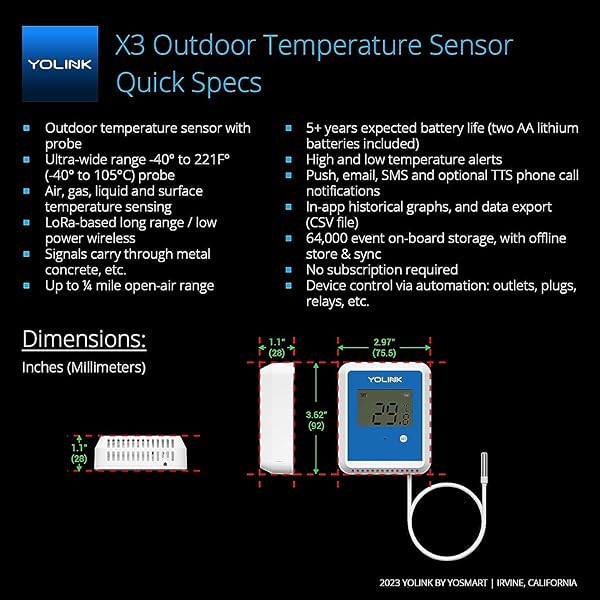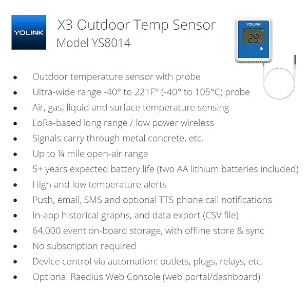 - YoLink Smart X3 Version Outdoor Temperature Data Logger with Probe, Thermometer, 1/4 Mile Range, 5+ Years Battery Life, Emails, Text, App Alerts, Alexa, IFTTT. Pool, Hot Tub, Fish Tank. Hub Included! with reliable performance and quality- VERY VERSATILE: many applications, including pool/hot tub & fish tank water, wood boiler, fridge and deep freezer, livestock water trough, milk, beer, wine, water, steam and pipe temperature monitoring. Additional uses include composting, HVAC/he