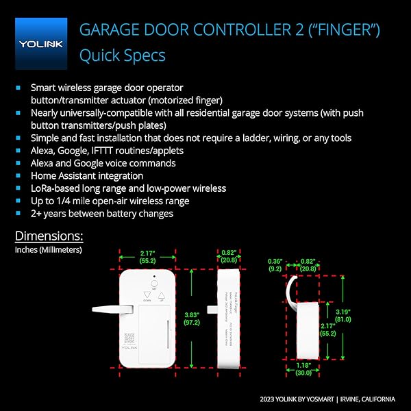 - YoLink Finger - Remote Control Existing Garage Door Opener, 1/4 Mile World's Longest Range Garage Door Operator Controller, YoLink Hub Required offers reliable performance and quality- MAKE IT SMART! Economically convert your existing non-smart garage door to smart, and enjoy the benefits of door control from the app, from your Alexa or Google voice assistant, from one of your YoLink fobs, or via automation or integration with IFTTT, Home Assistant, etc