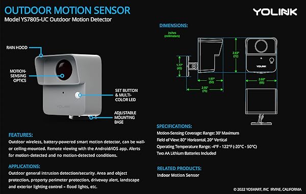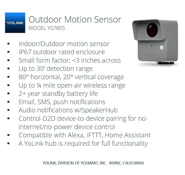 - YoLink LoRa Smart Outdoor Motion Sensor, Driveway Alert, Property Invasion/Tresspassing Detector, 1/4 Mile Open Air Range, Email/SMS/Push Alerts, Alexa, IFTTT, Home Assistant (Hub Included!) with reliable performance and quality- PROTECT YOUR PERIMETER and prevent crime at your property line! With our LoRa-based up to 1/4 mile wireless range, you can now put security devices where it was once very costly, or impossible. Remote buildings, sheds, barns, fencelines, driveway entrance