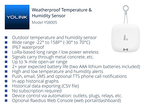 - YoLink Smart Outdoor Temperature & Humidity Sensor, Hygrometer, Thermometer, 1000' Long Range, 2+ Years Battery Life, App Alerts, Text/SMS, Email Alerts, Alexa, IFTTT Integration. Hub Included! with reliable performance and quality- Monitor & Manage Temperature & Humidity Remotely: using the free, no subscription-required and user-friendly YoLink app, you will know the temperature and humidity at a glance, whether you are in the other room or on the other side of the world.<l