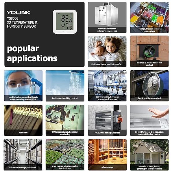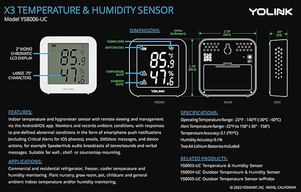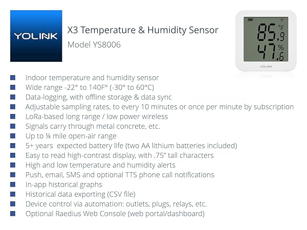 - YoLink X3 version Temperature & Humidity Sensor, Supports App Real-Time Data Refresh, Alexa, IFTTT, Home Assistant Integration - YoLink Hub Included with reliable performance and quality- READY FOR BUSINESS OR HOME: In addition to the features of our family of smart temperature & humidity sensors, this new X3 line sensor features advanced sensor data streaming and storage. View real-time sensor status, and record activity as frequently as 10 minute* intervals. If not connected to
