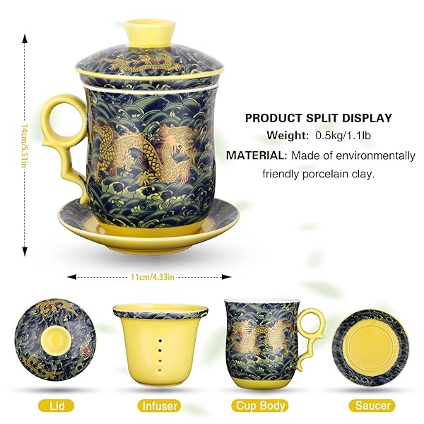 - YURROAD Chinese Dragon Pattern Tea-Mug with Strainer Infuser and Lid and Saucer Ceramic Tea Mug Convenient System Chinese Porcelain Personal Tea Cup 13.5oz(400ml) - DARK GREEN TC400 offers reliable performance and quality- Convenient Tea System Design: 4pcs set of Chinese Dragon Pattern Tea-Mug with Strainer Infuser and Lid and Saucer helps to brew tea in a simple and quick way- Special Shape & Heat-insulated handle. Material: Chinese porcelain