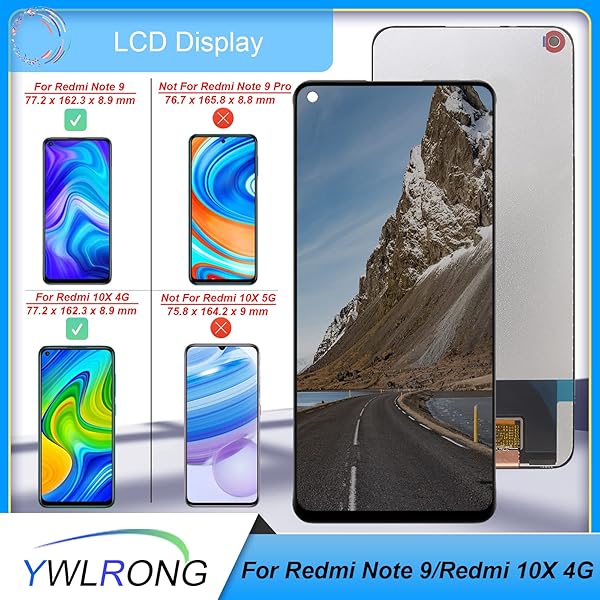 - YWLRONG Display for Xiaomi Redmi Note 9 Screen Replacement LCD Touch Screen Digitizer Assembly for Xiaomi Redmi 10X 4G LCD with Tools offers reliable performance and quality- Compatibility: For Xiaomi Redmi Note 9/Redmi 10X 4G(Not for Redmi Note 9s/9 Pro) LCD Display.Please make sure your phone model before purchase.If you can't confirm your phone model Please contact us to help you to conform