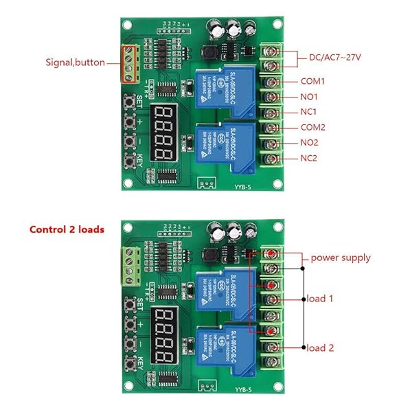 - YYB-5 12v 24v Forward/Reverse Motor Control Board Two Relay Timing Cycle Module offers reliable performance and quality- 6 KINDS OF FUNCTIONSThe module has 6 kinds of commonly used functions to meet the needs of more applications- WIDE APPLICATIONThe electrical motor control board can control 2-way solenoid valve, pumps, motors, lights and other running freely- TIME RANGEThe time range of the module is 0.1 seconds to minutes and is adjustable any time