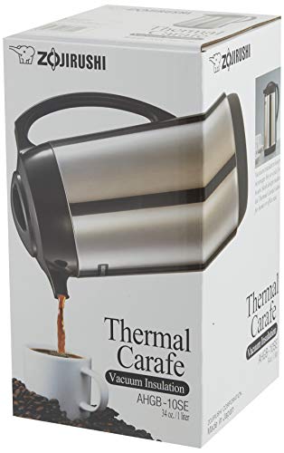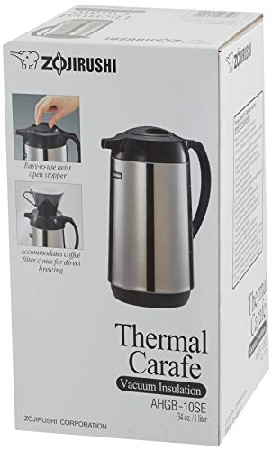 - Zojirushi AHGB-10SE, Thermal Serve Carafe, 34 oz. / 1.0 liter, Polished Stainless Steel, Made in Japan provides reliable performance and quality- High quality durable vacuum glass liner- Easy-to-open twist open stopper- Accommodates coffee filter cones for direct brewing- Sleek design ideal for home or office use