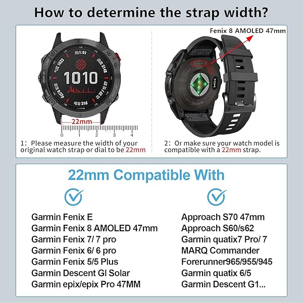 - ZPJPPLX 22mm Quick-Fit Silicone Band Compatible with Garmin Fenix 8 AMOLED 47mm/7 Pro/7/6 Pro/6/5 Plus/5, Sport Replacement Straps For Fenix E/Forerunner 965/955/945/Approach S70 47mm/quatix 7 Pro with reliable performance and quality- Compatible models: This 22mm width sport silicone band compatible with Garmin Fenix 8 AMOLED 47mm,Fenix E,Fenix 7 Pro,Fenix 7,Fenix 6 Pro,Fenix 6,Fenix 5 Plus,Fenix 5,Forerunner 965,Forerunner 955,Forerunner 945,Forerunner 935,Epix,Approach S70 47mm